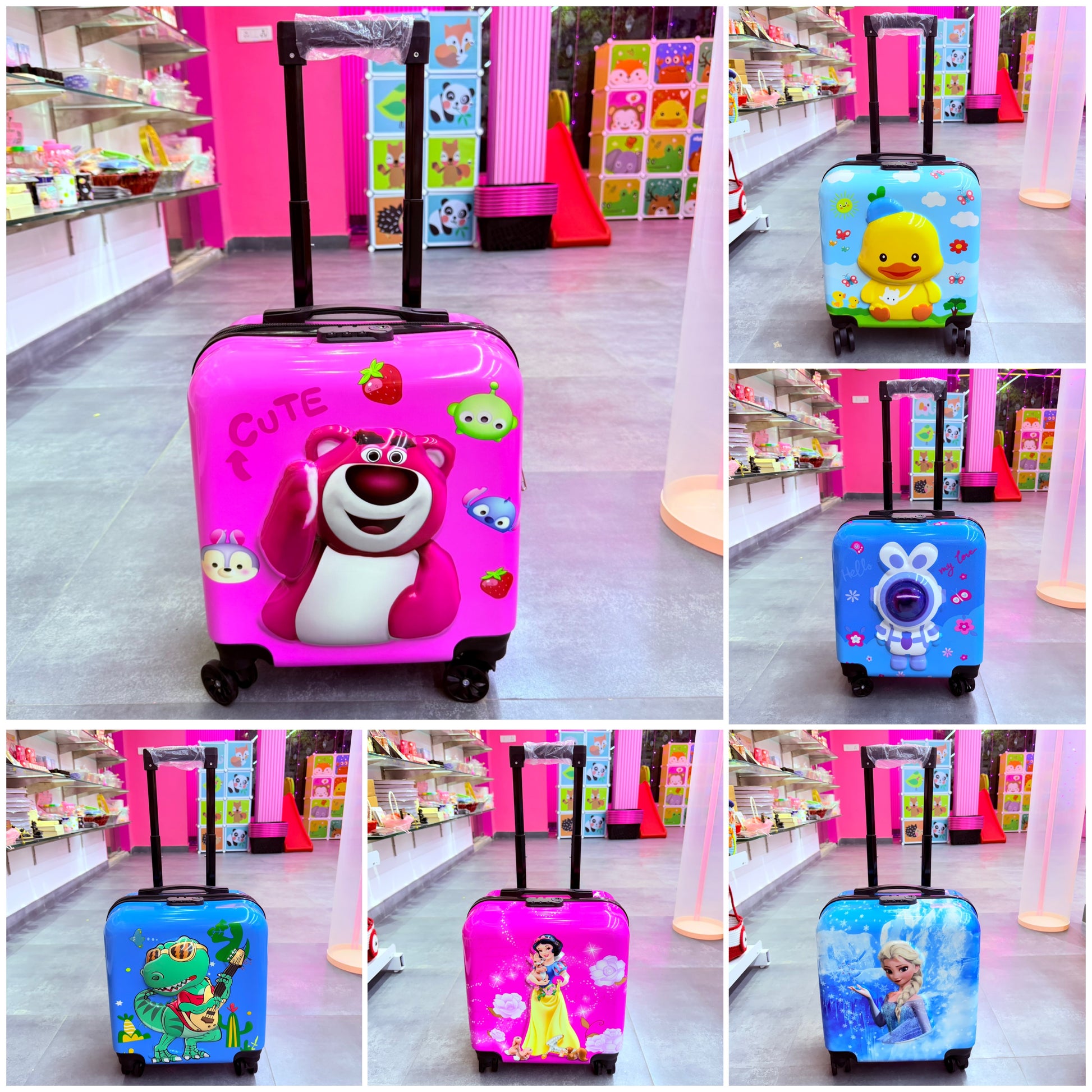 This image features a collection of vibrant children's hardshell suitcases designed with a variety of popular animated characters.