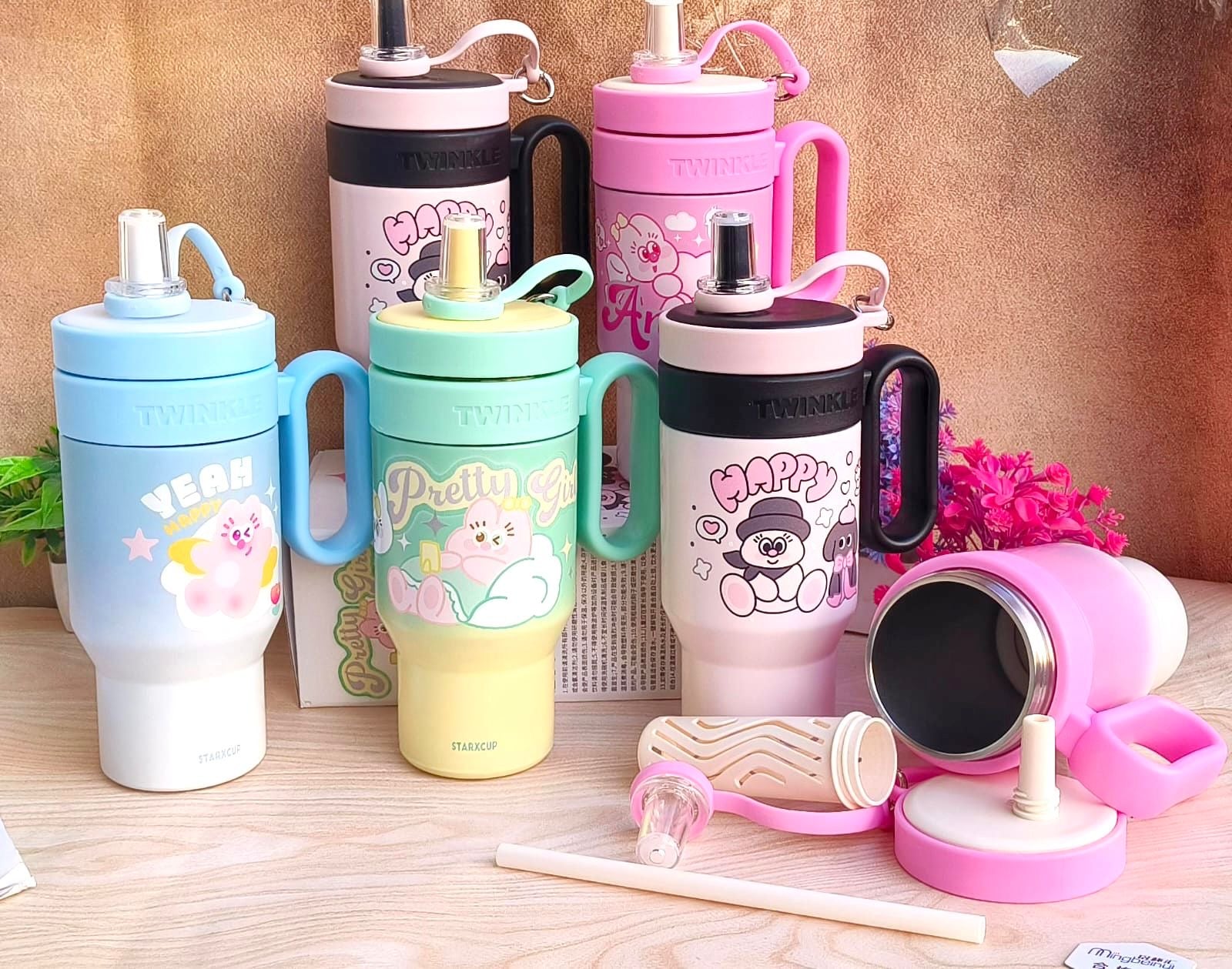 Sanrio and Disney Tumblers: Large-capacity (often 1200ml) stainless steel vacuum-insulated tumblers featuring popular characters like Hello Kitty, Kuromi, Mickey Mouse, and Lilo & Stitch. Many include matching 3D character straw toppers.