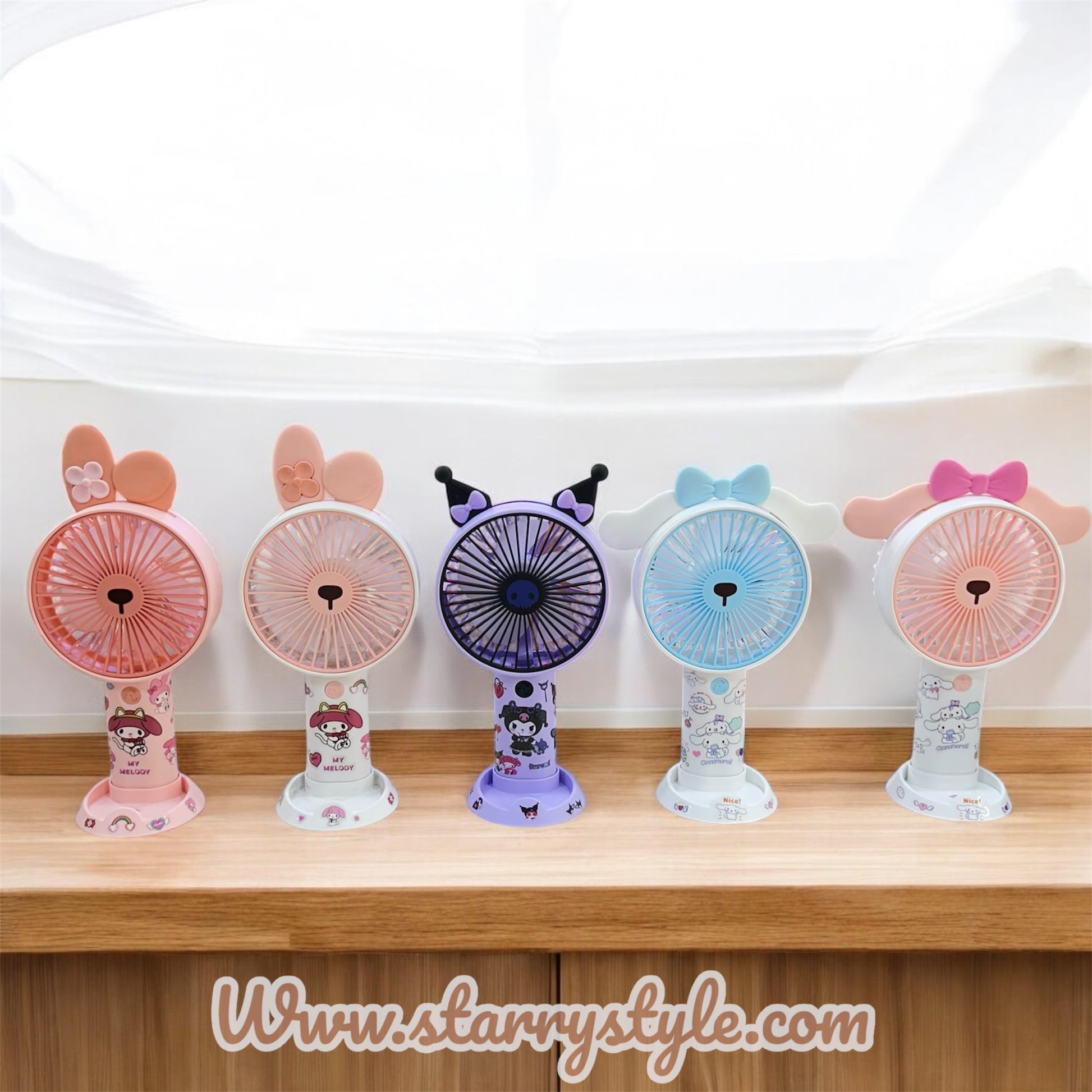 Character Designs: The fans are themed after popular Sanrio-inspired characters, including My Melody (pink and white), Kuromi (purple), and Cinnamoroll (light blue and white).