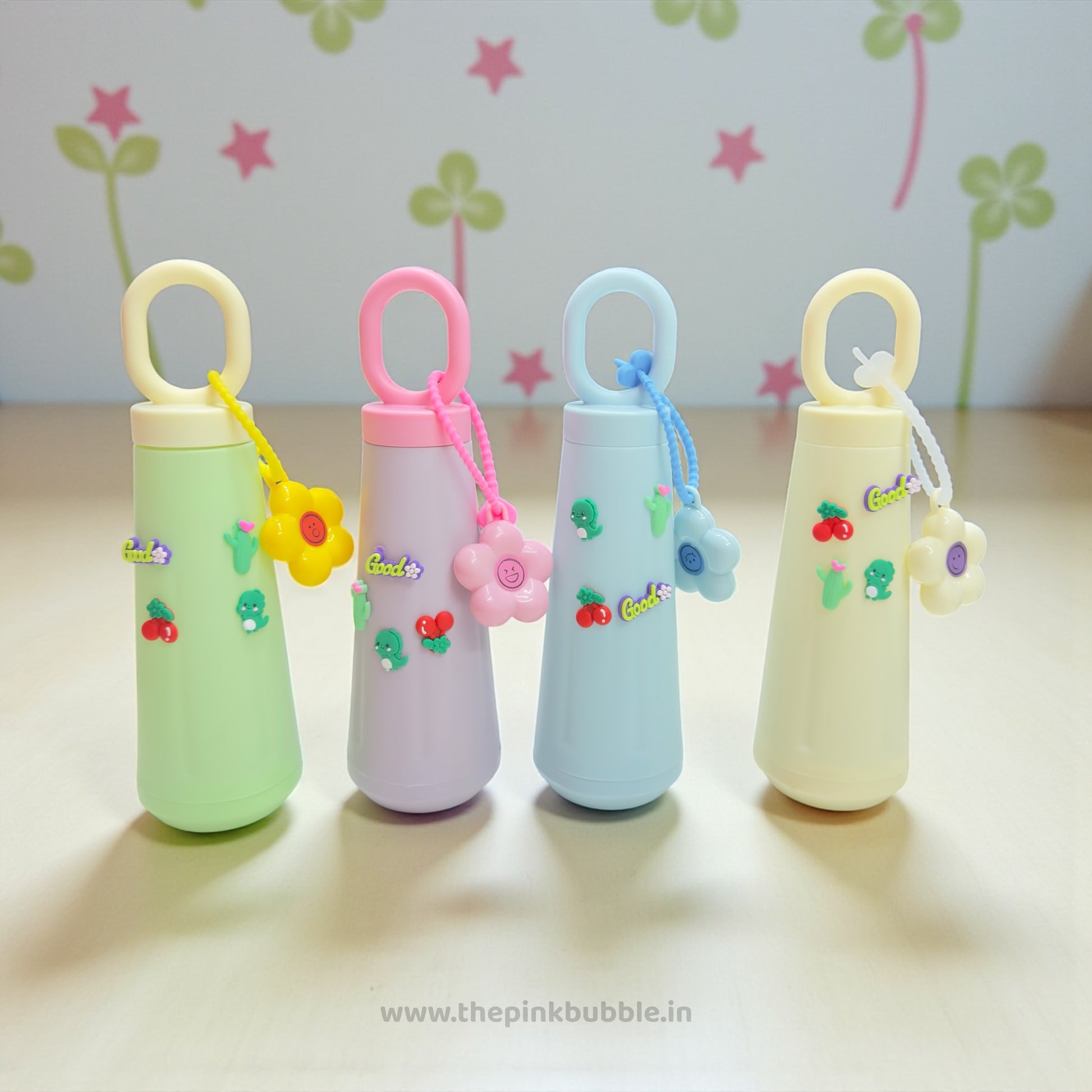 3D Charms: Each bottle is decorated with small, raised 3D icons, including cherries, cacti, dinosaurs, and the word "Good".