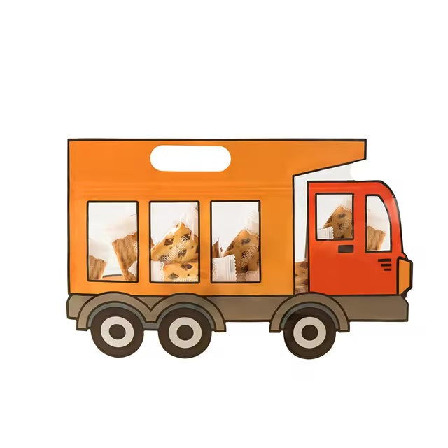 Functional Features: It includes a die-cut handle at the top for easy carrying and a transparent finish that allows the contents to be partially visible through the "windows" of the truck.
