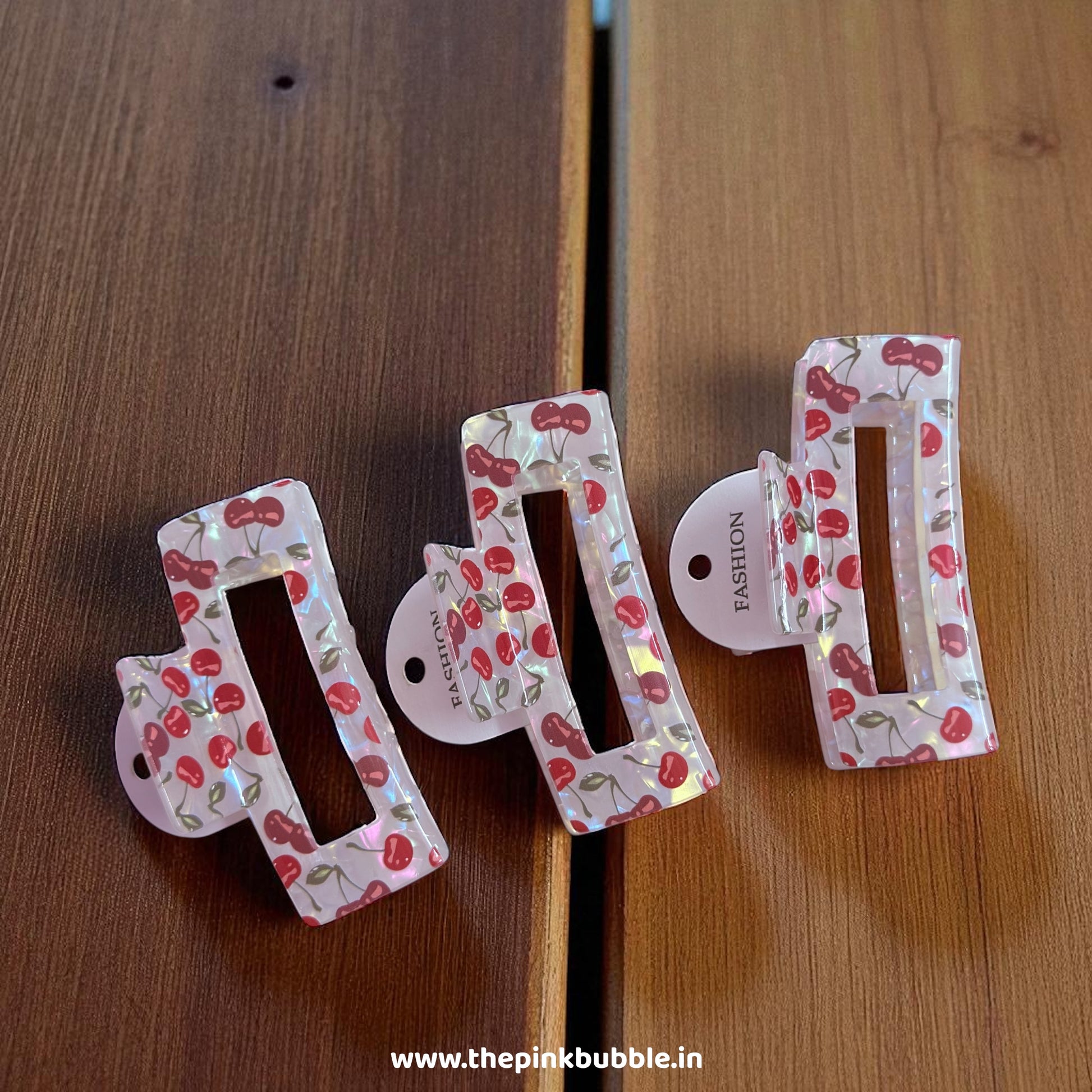 This image features a charming set of cherry-patterned hair claws with a playful, retro aesthetic.