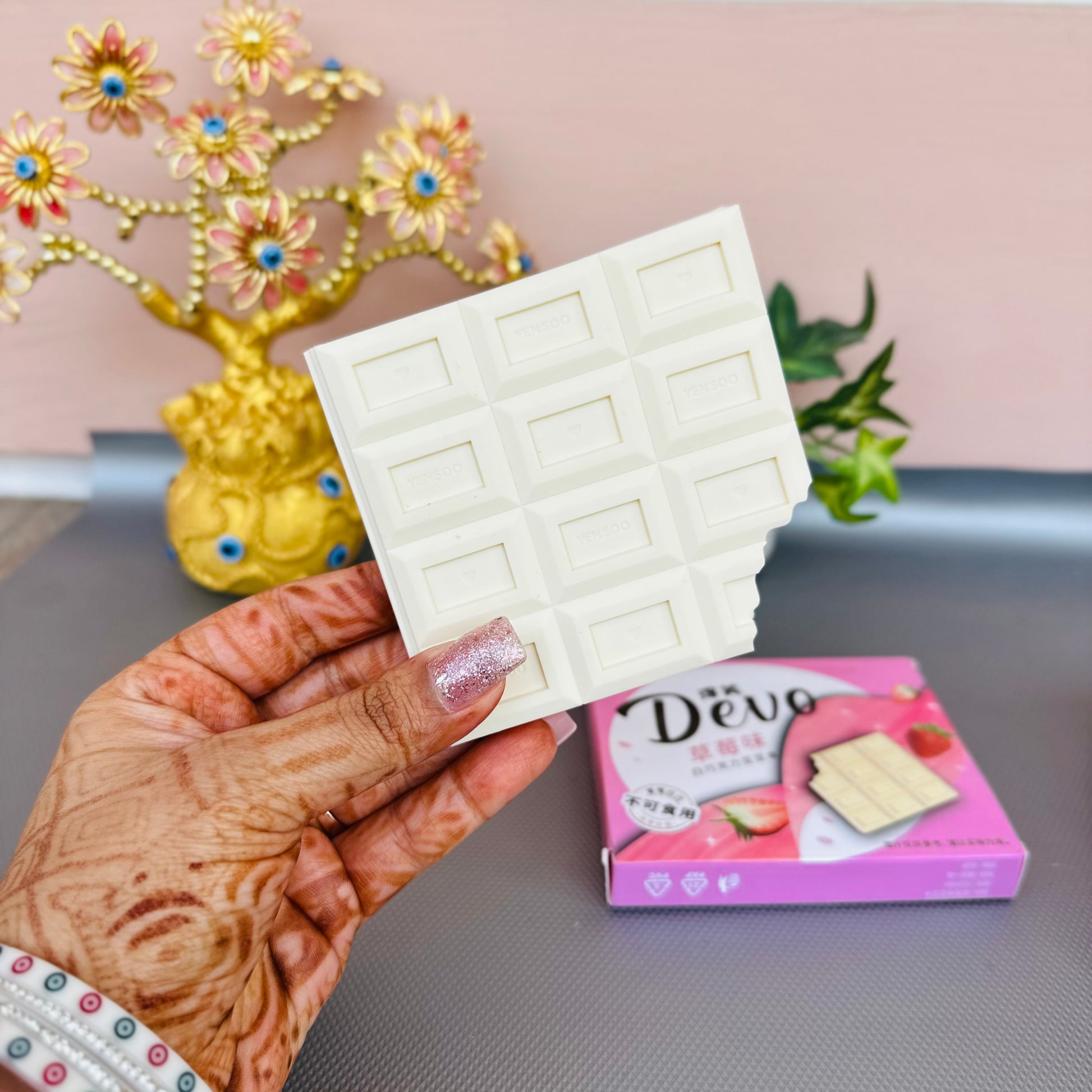 A white chocolate bar featuring similar grid detailing and a missing corner.