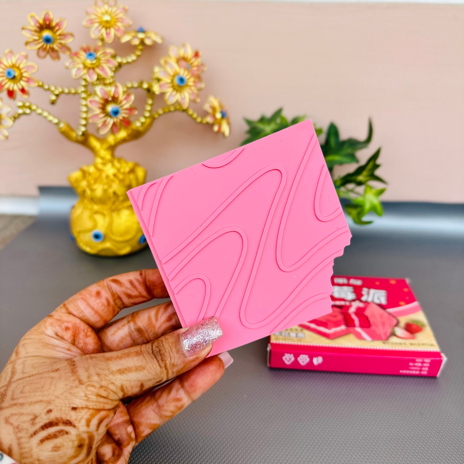 A dark chocolate bar with a realistic "grid" pattern and a "bite" taken out of the corner.