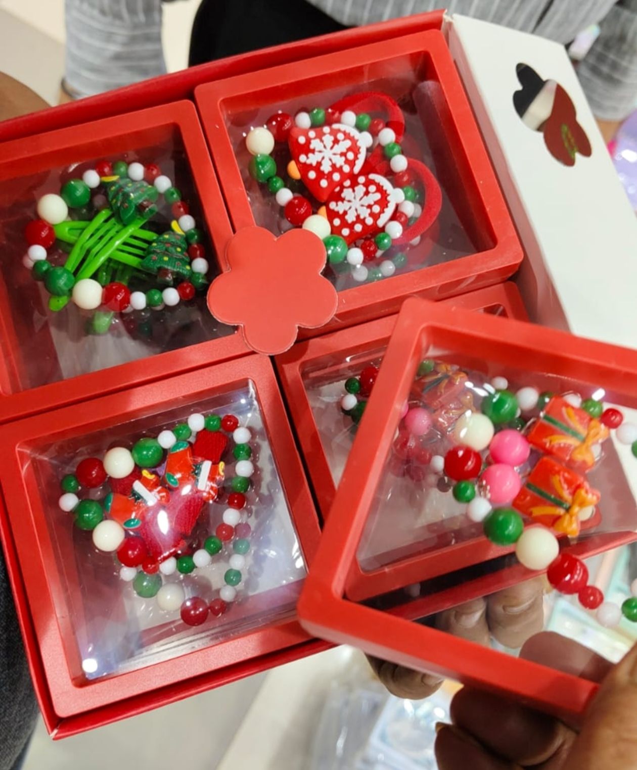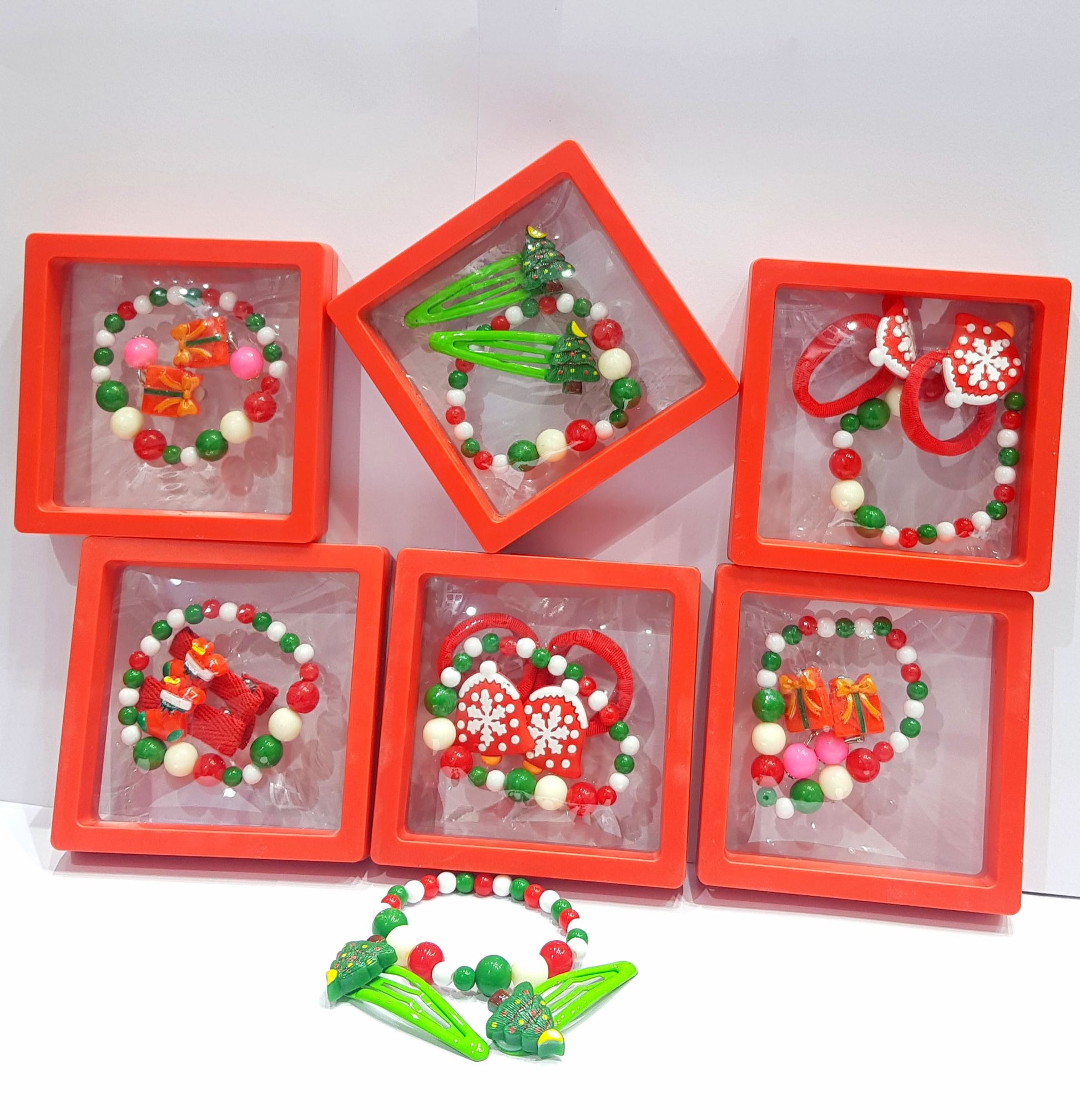 Hair Accessories: The assortment includes bright green hair clips adorned with miniature Christmas trees and red hair ties with snowflake-patterned charms.