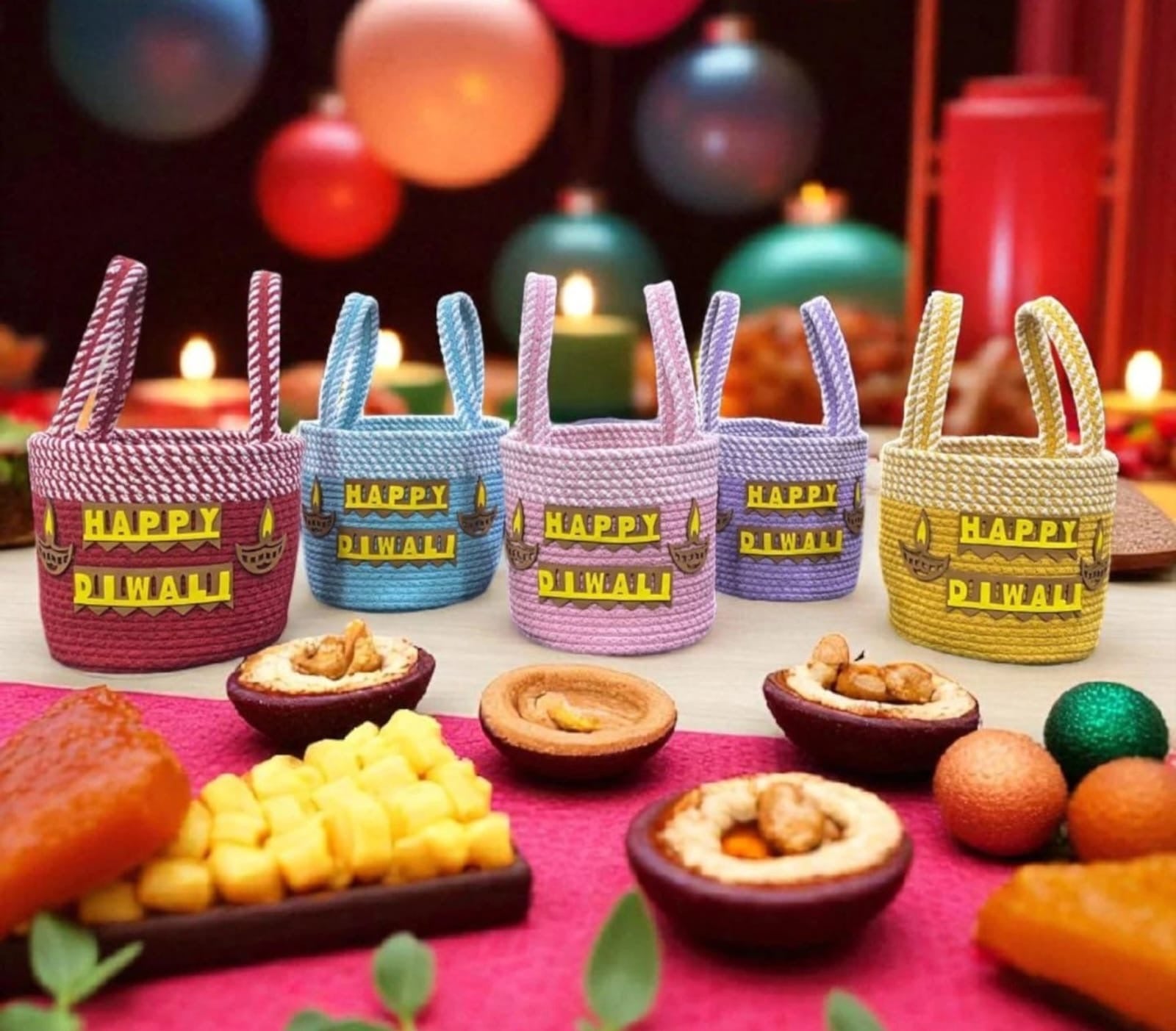Woven Baskets: Five small, hand-woven rope baskets in shades of maroon, blue, lilac, purple, and yellow. Each is adorned with a "Happy Diwali" plaque and small diya (lamp) icons.