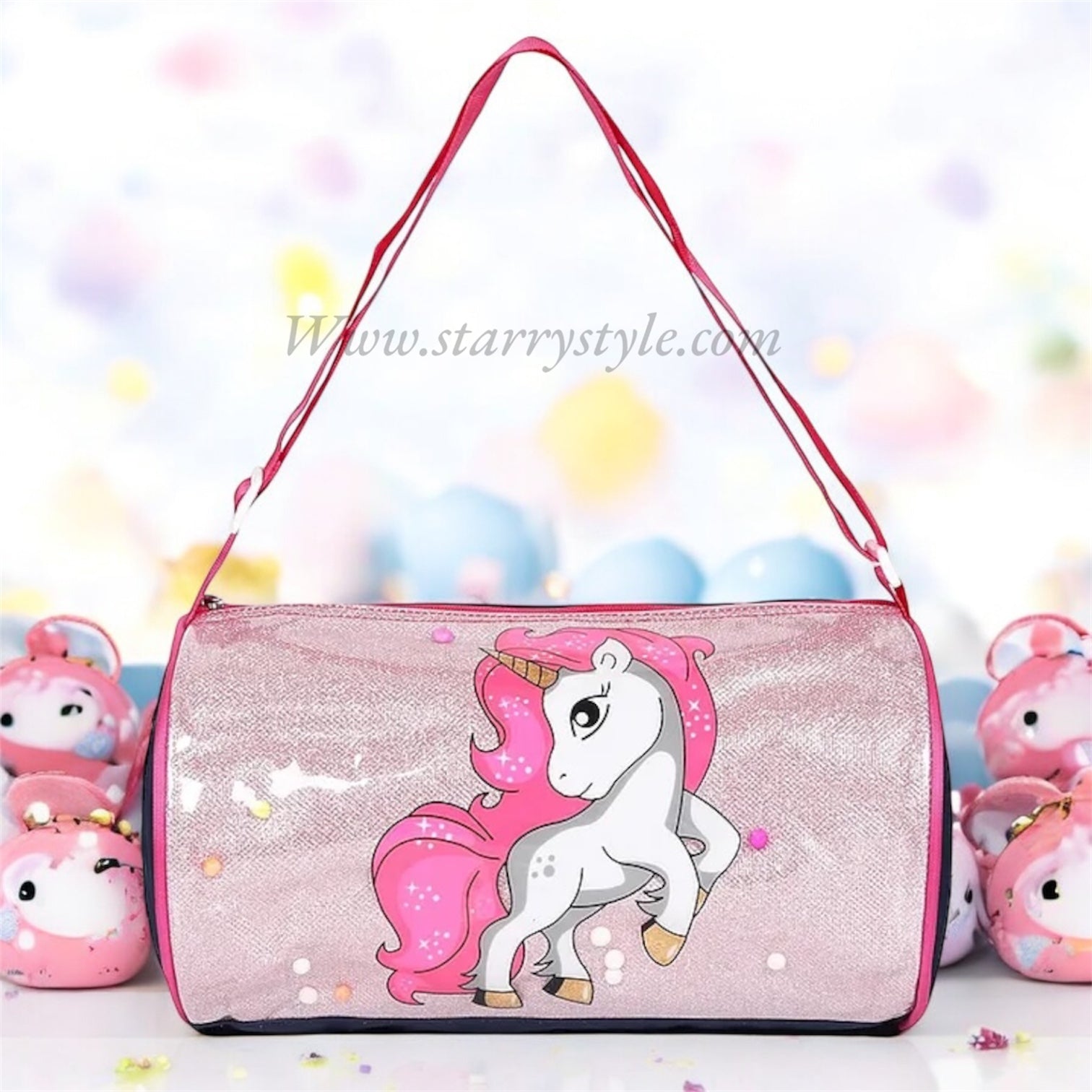 This image features a pink unicorn-themed cylindrical duffel bag designed for children, showcasing a shimmering and playful aesthetic.