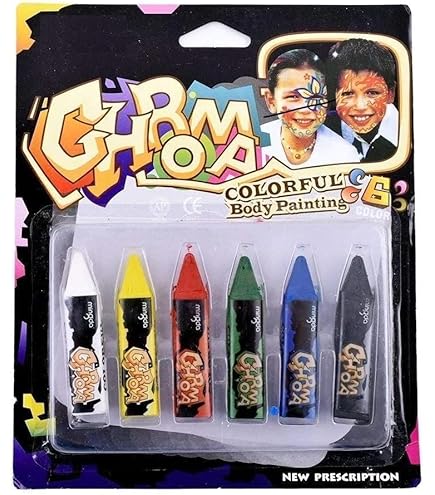 The set includes six individual face and body painting sticks in a variety of vibrant primary and secondary colors. The packaging features examples of how the product can be used for face painting on children.