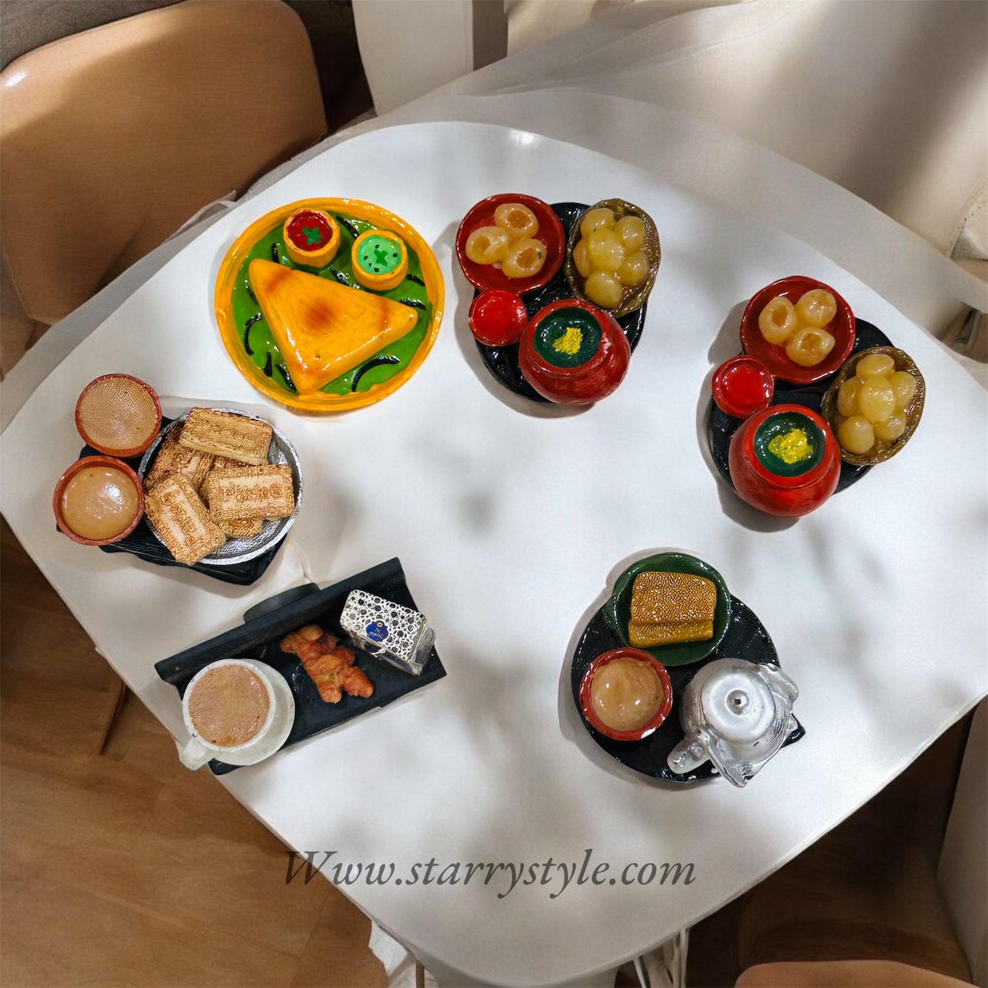 This image showcases a charming collection of miniature food models, intricately handcrafted to represent traditional South Asian snacks and tea culture. Each piece is meticulously detailed and vibrant, set against a clean white background.