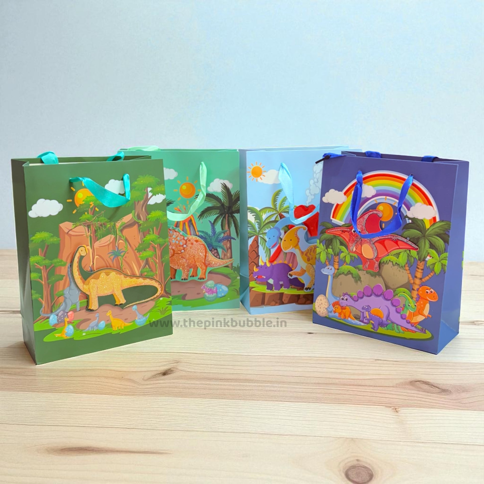 This image features a set of four dinosaur-themed gift bags standing on a light-colored wooden surface.