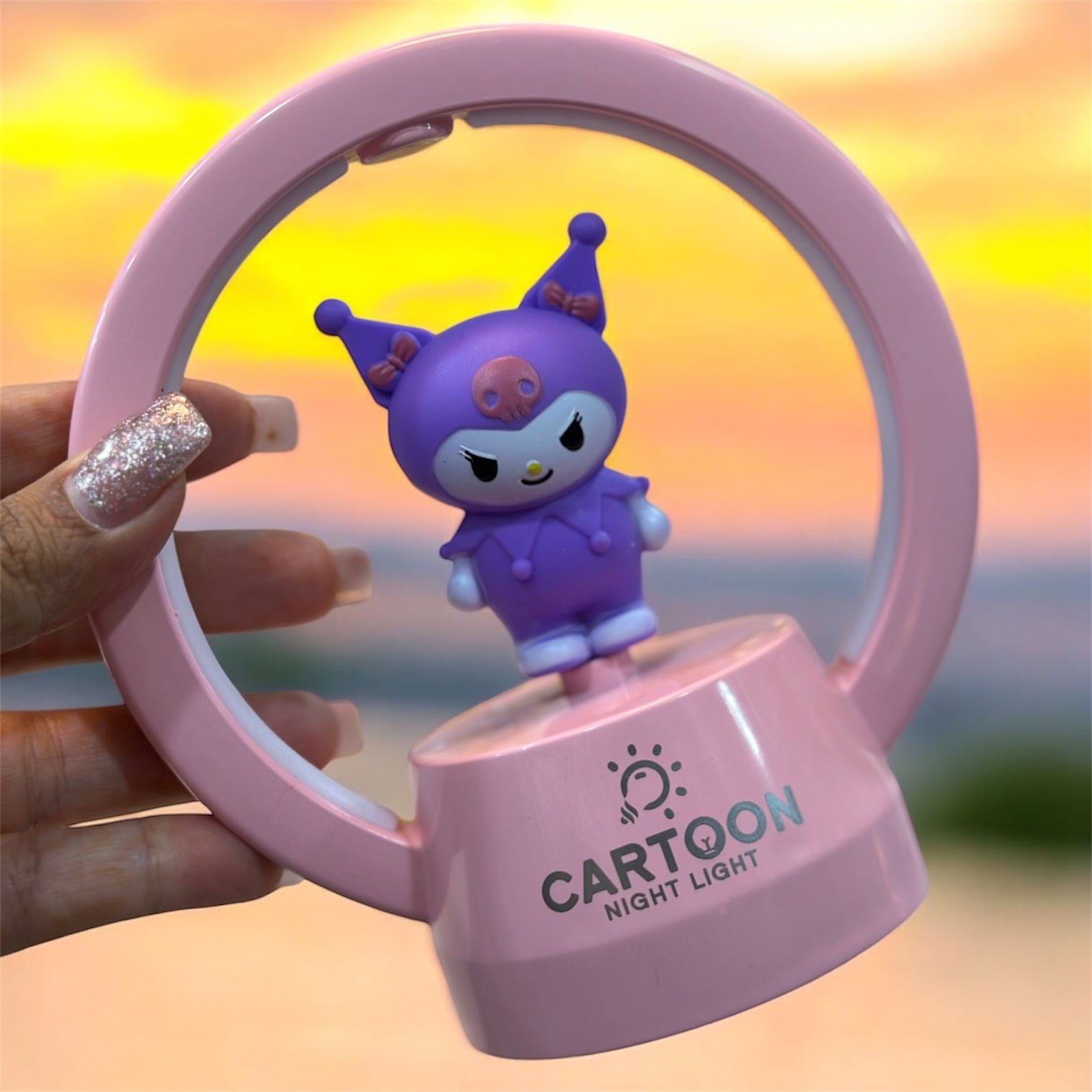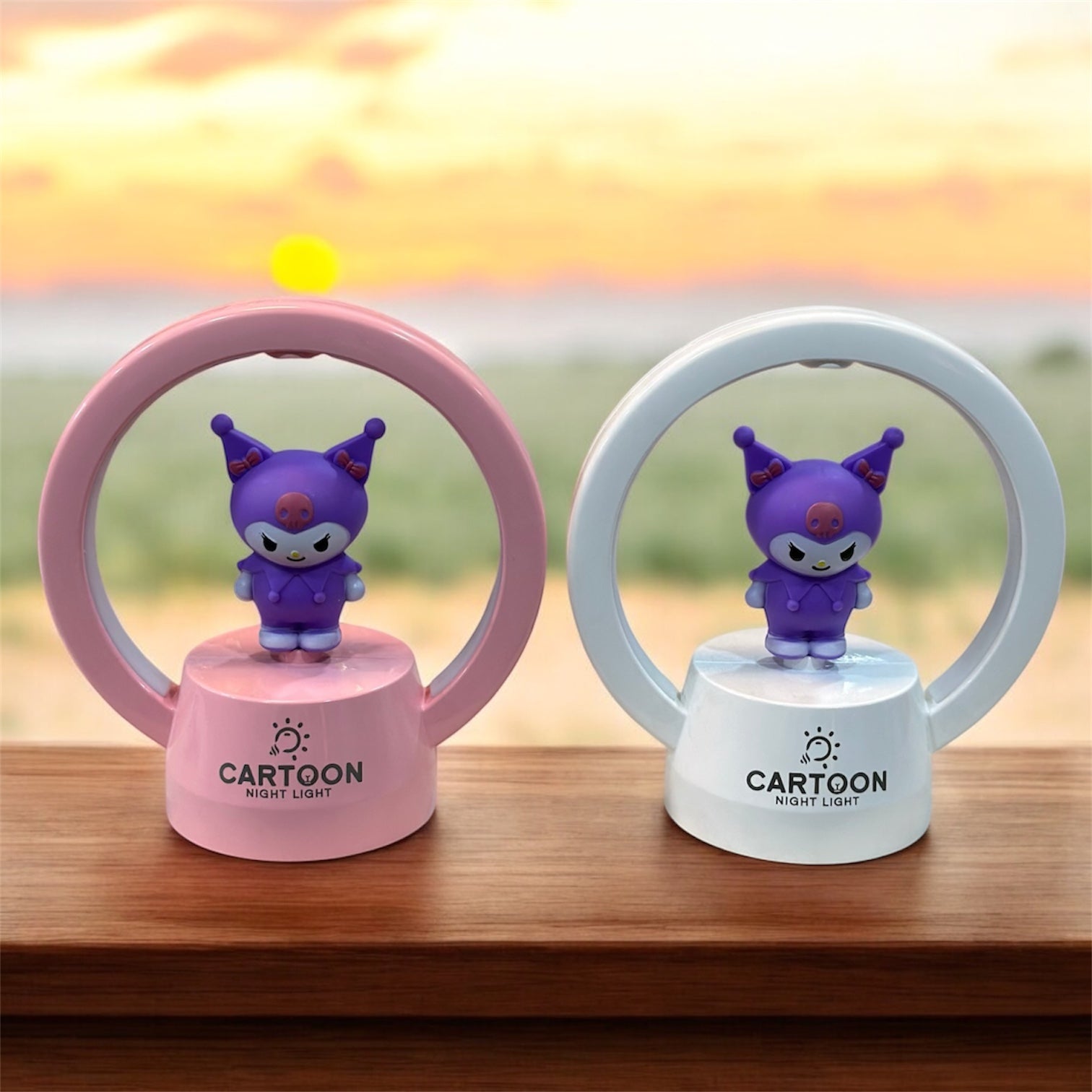 This image displays two "Cartoon Night Lights" featuring figurines of the character Kuromi. The lights are designed with a modern, circular aesthetic and are presented in two color options: pastel pink and crisp white.