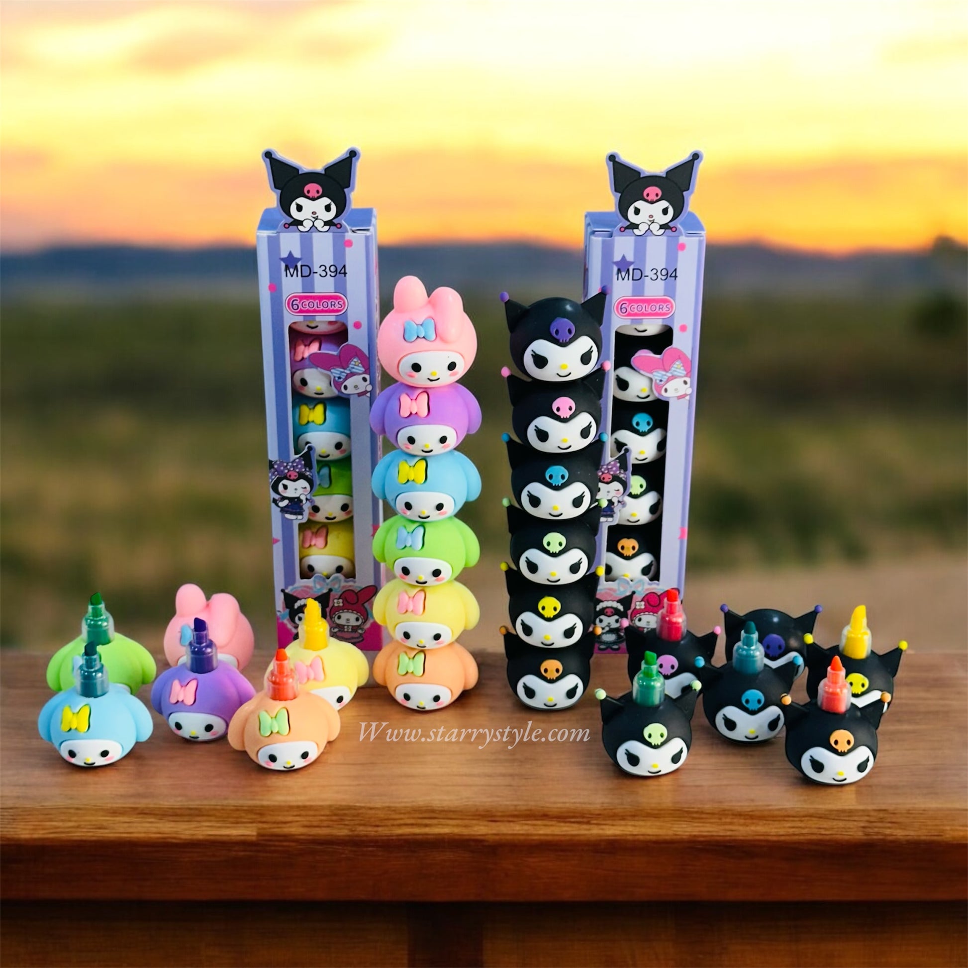 Characters: The highlighters are shaped like the heads of My Melody (pastel colors with bows) and Kuromi (black with skull motifs).