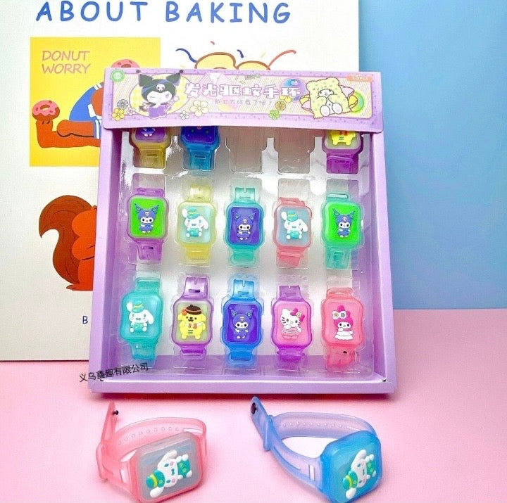 This image shows a colorful display set of Sanrio-themed mosquito repellent bracelets for children. These silicone wristbands are designed to look like digital watches and feature popular characters like Kuromi, Cinnamoroll, My Melody, Pompompurin, and Hello Kitty.