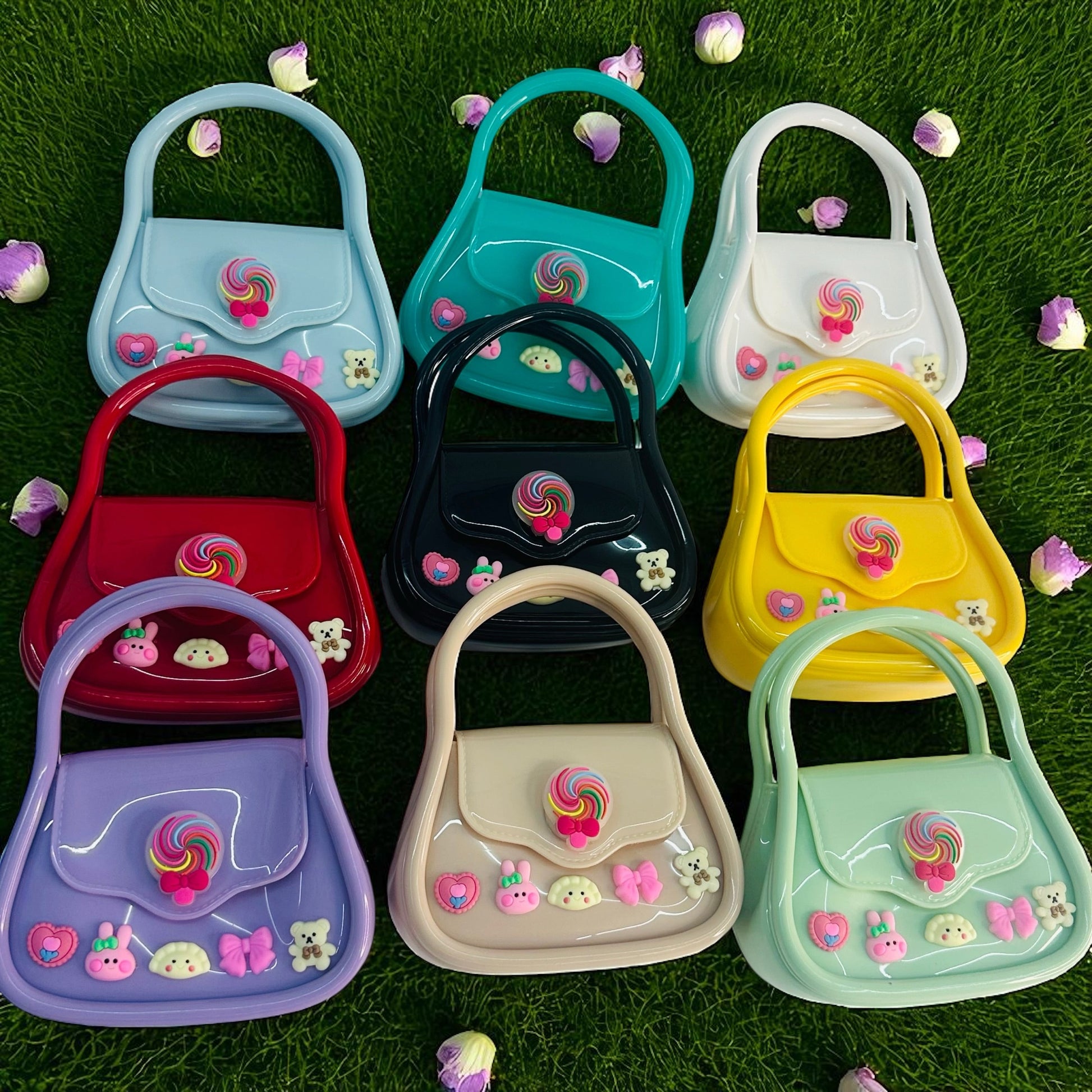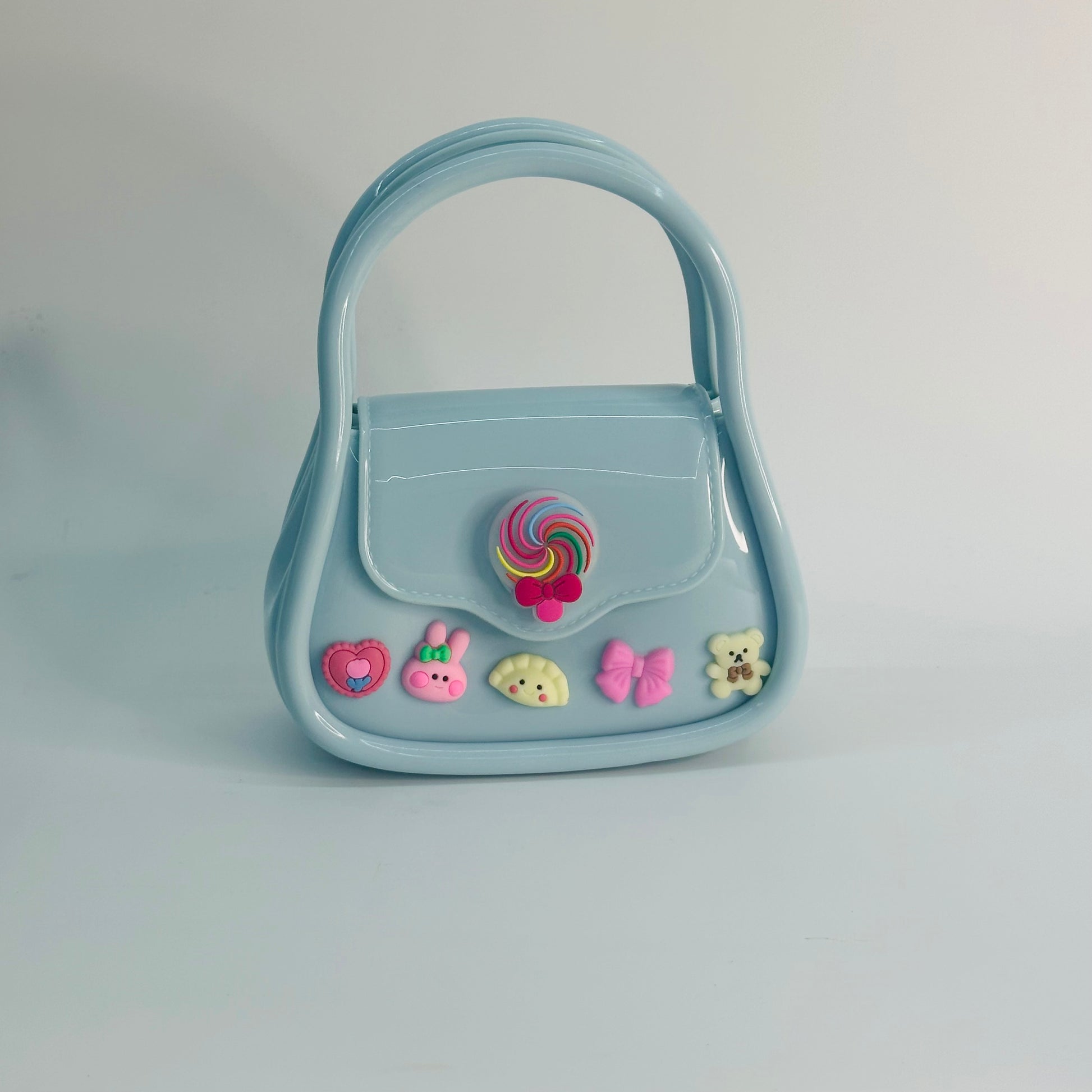Kawaii Embellishments: Each bag is decorated with a variety of colorful 3D charms, including bunnies, bears, bows, hearts, and various treats.