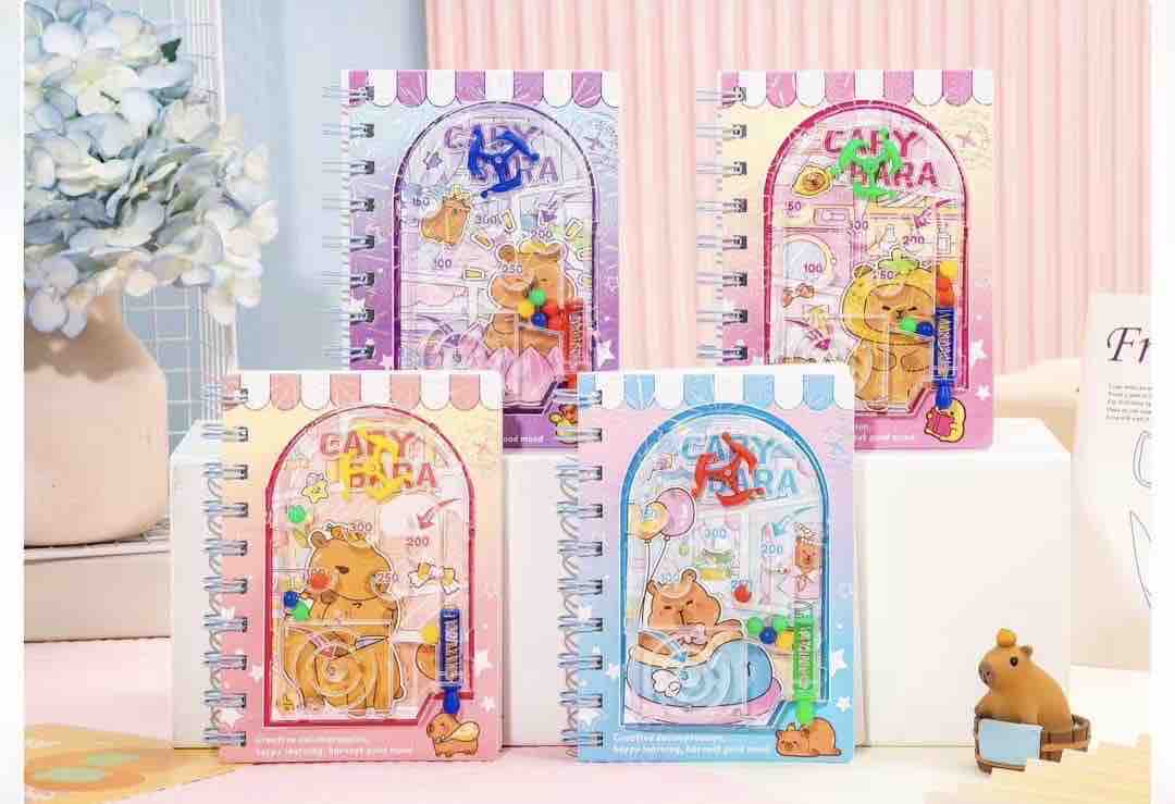 This image features a set of four capybara-themed spiral notebooks that incorporate an interactive pinball-style game on the front covers. These notebooks blend stationery with entertainment through their playful design.