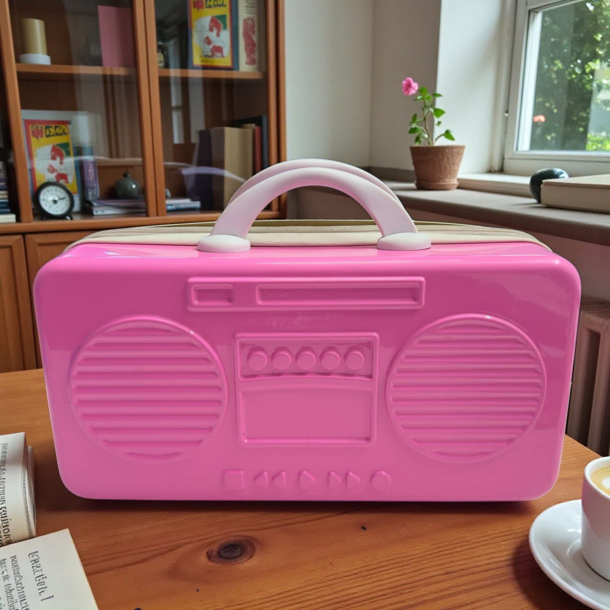 The Main Items: Three plastic cases designed to look like retro boomboxes sit in a row. They come in bright pink, blue, and yellow, each featuring molded speaker details, buttons, and a sturdy white handle.