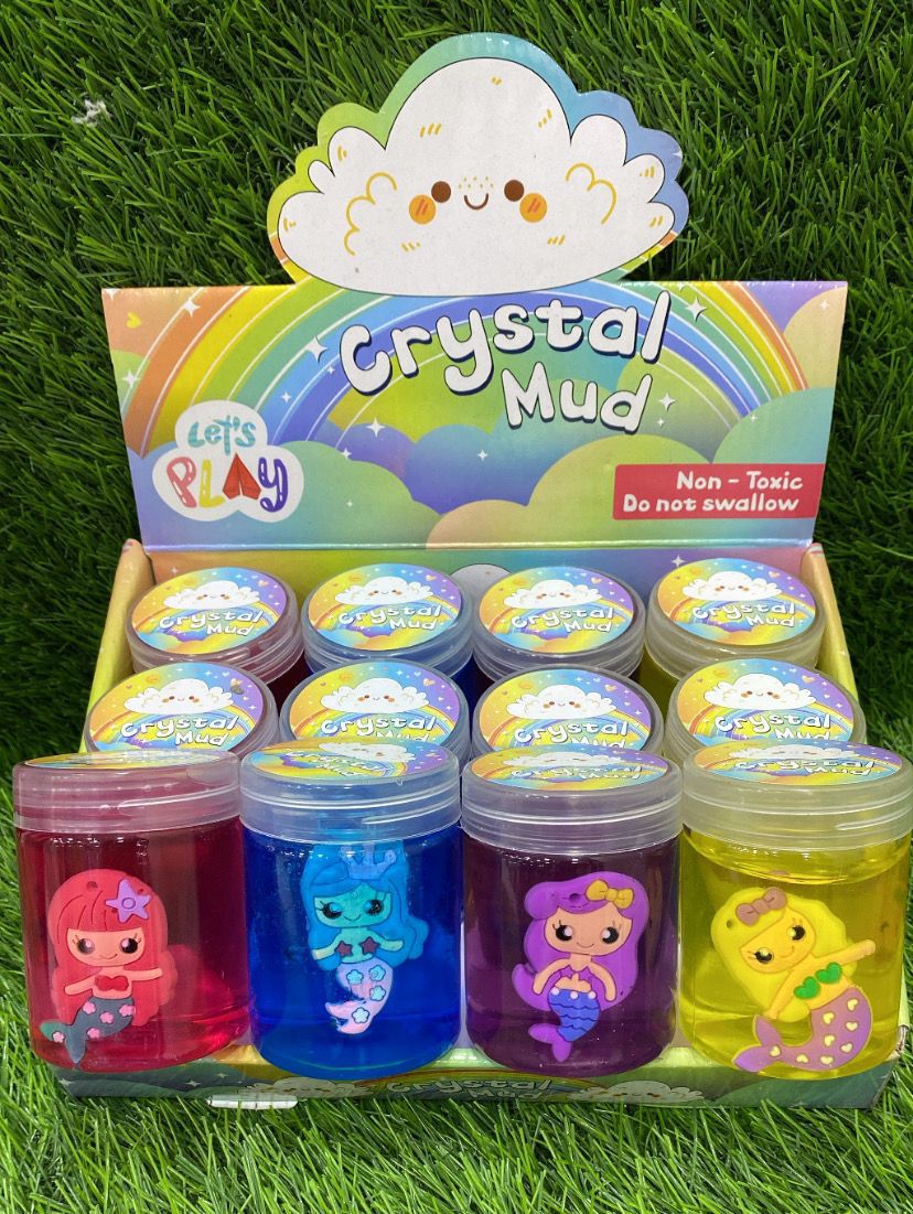 "Crystal Mud" Slime Set: A display box featuring twelve clear containers of colorful "Crystal Mud". Each jar contains a small mermaid figurine and comes in vibrant colors like red, blue, purple, and yellow. The packaging notes it is non-toxic but not for swallowing.