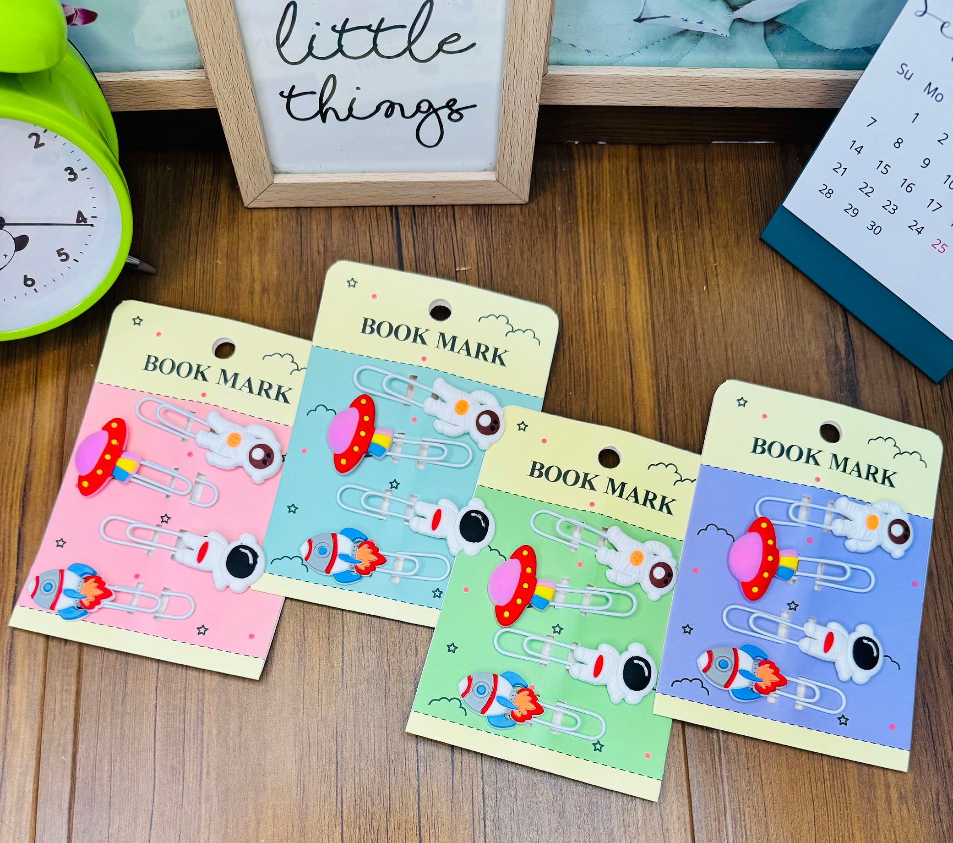 This image shows four sets of outer space-themed bookmarks presented on a wooden surface alongside a green alarm clock and a calendar. These bookmarks are designed as large white paper clips topped with colorful decorative charms.