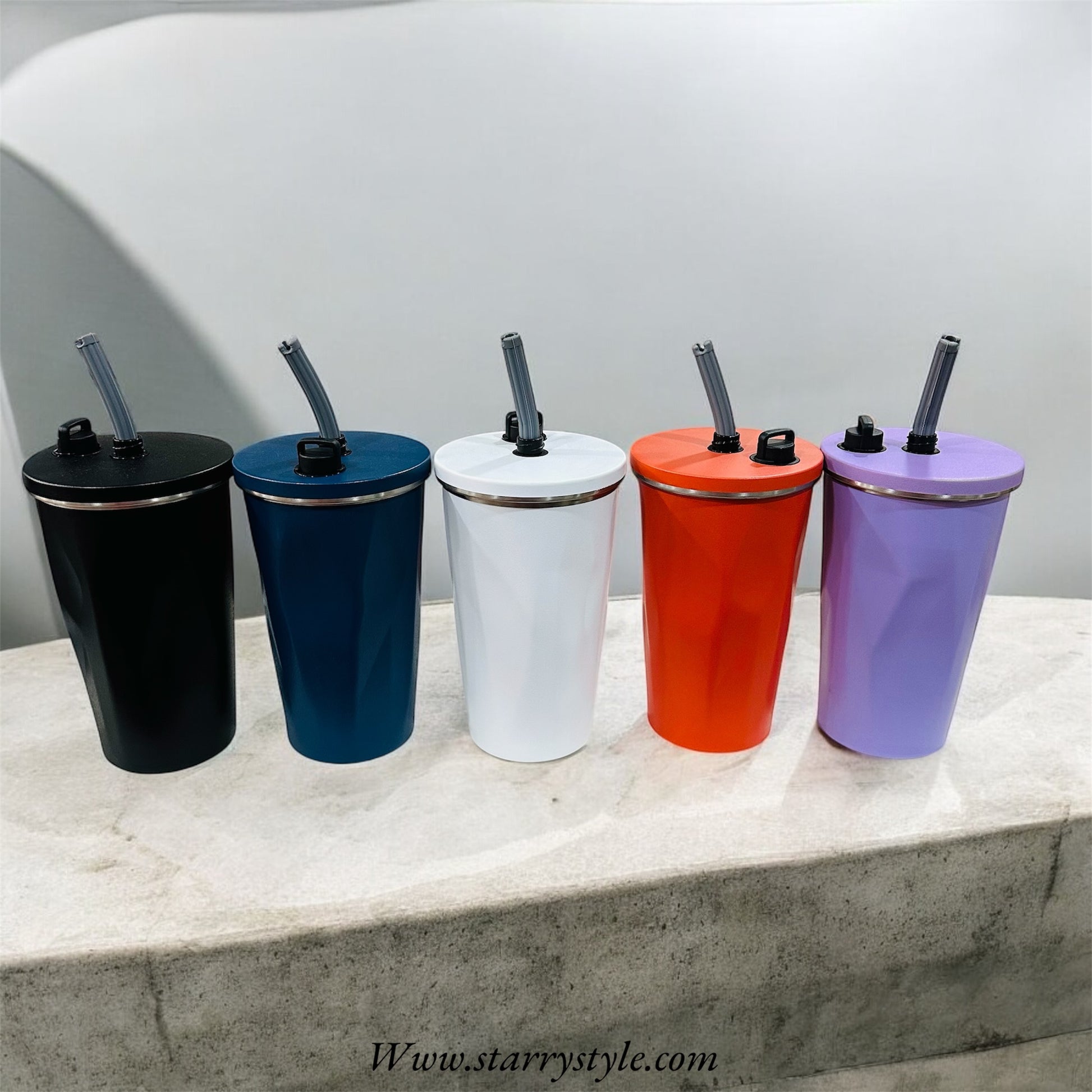 Stainless Steel Diamond Cut Coffee Cup with Steel Straw | Airtight Cap & Leak-Proof | 500 Ml | Assorted Colors | Box Packing