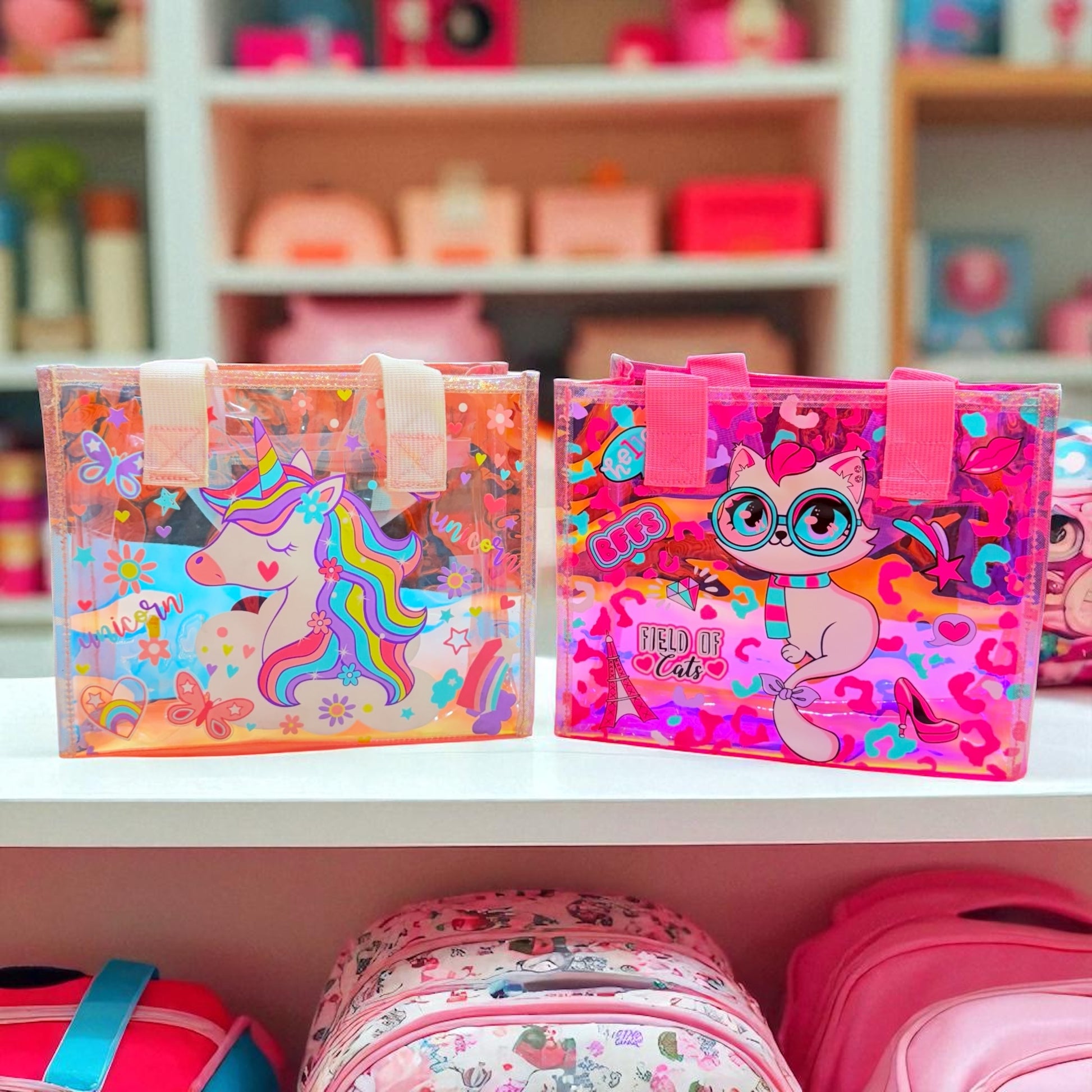 This image features two vibrant, semi-transparent tote bags displayed on a white shelf. The bags have a glossy, iridescent finish and are decorated with whimsical, colorful characters.